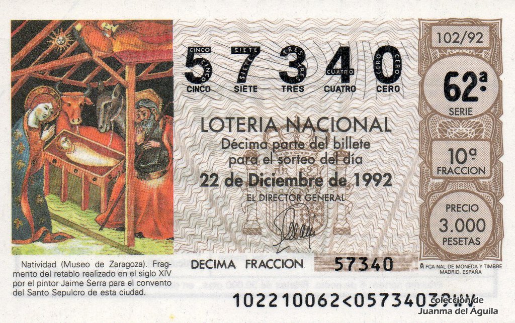 En 1992, debido a la incorporación de los sorteos de Lotería Nacional del jueves el sorteo extraordinario de Navidad fue el nº 102 del año. Además cambió toda la tipografía de impresión del décimo y desapareció la numeración magnética en los décimos.