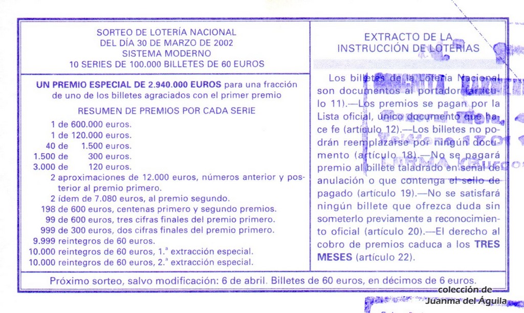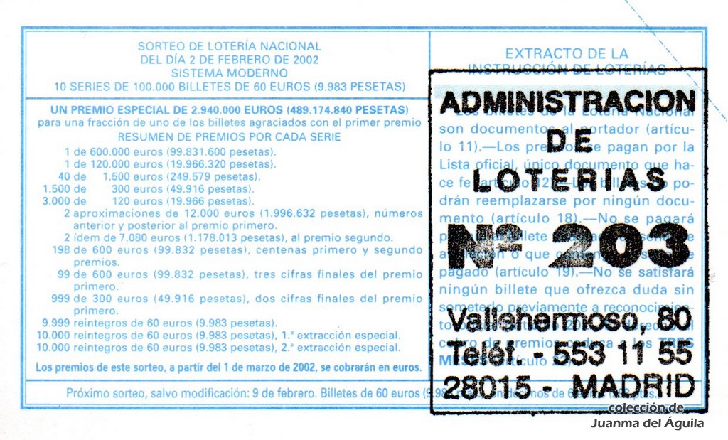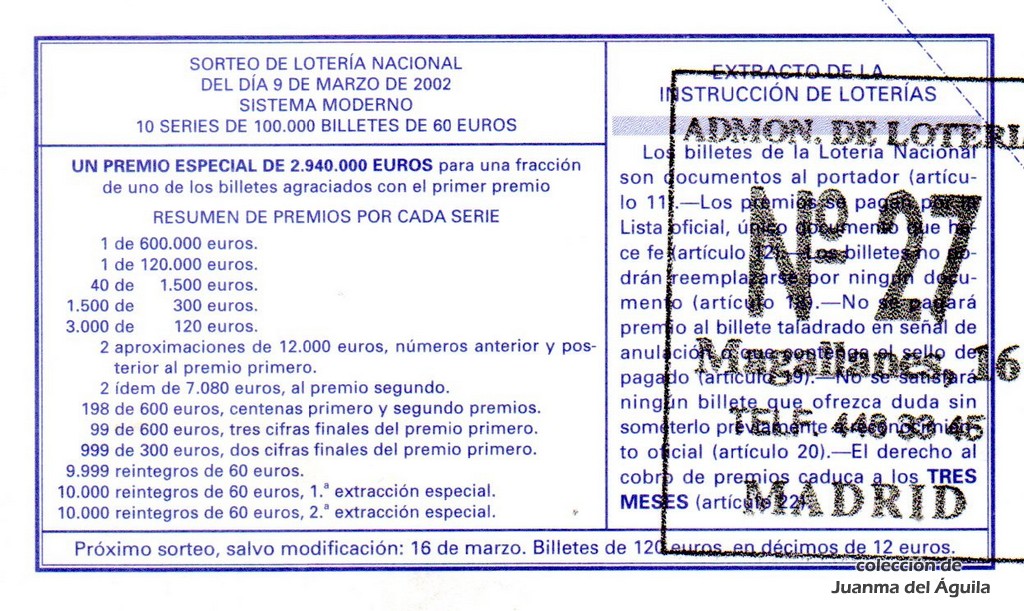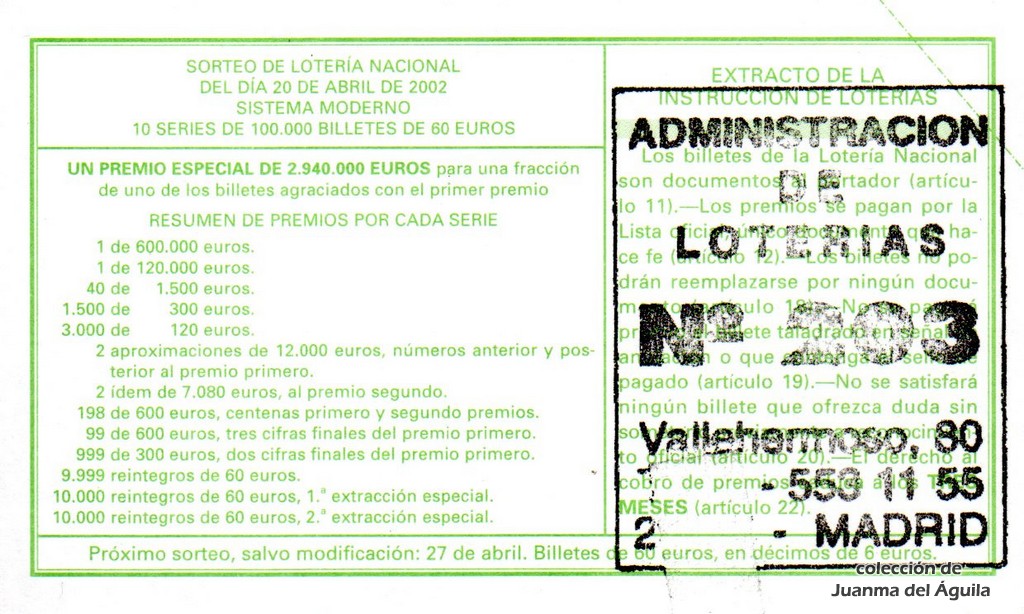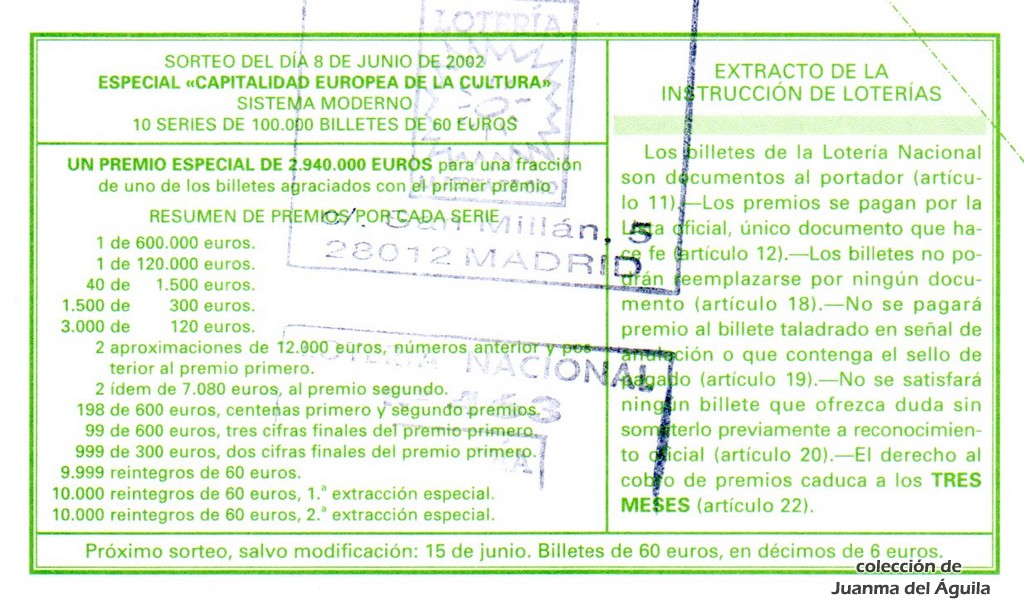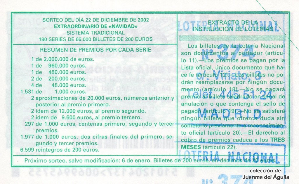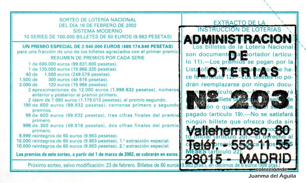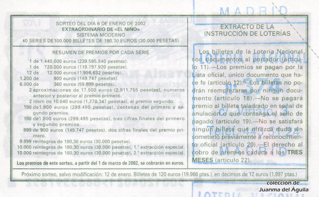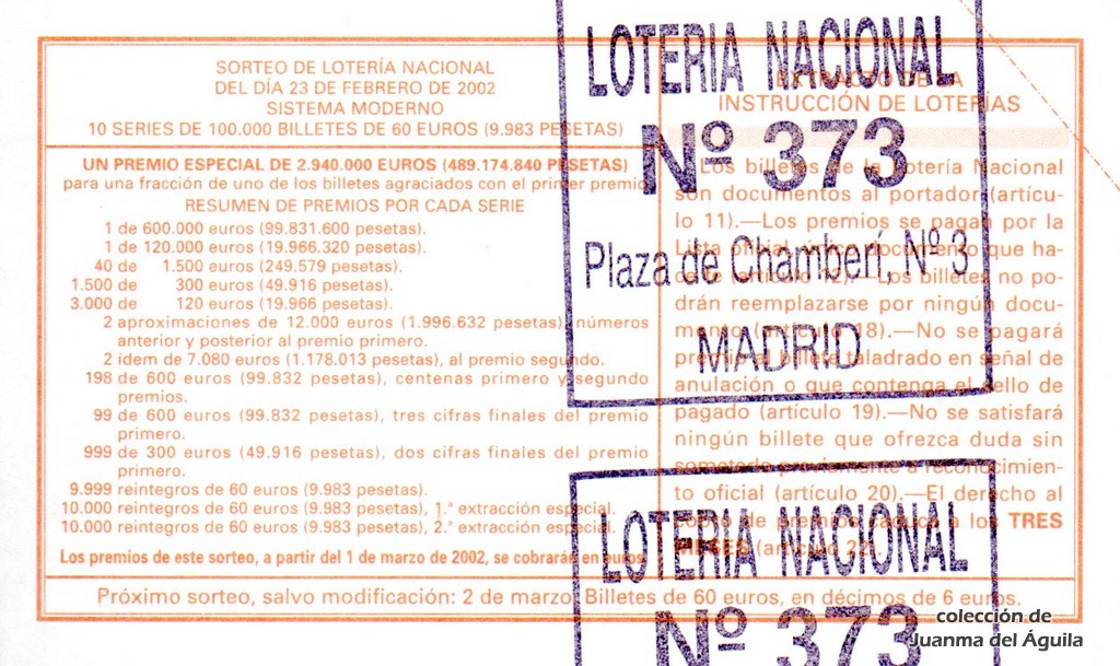Los premios de este sorteo, a partir del 1 de marzo de 2002, se cobrarán en euros.