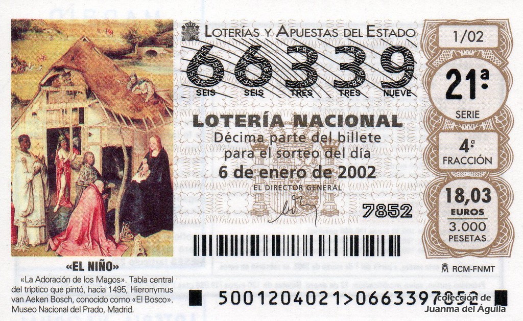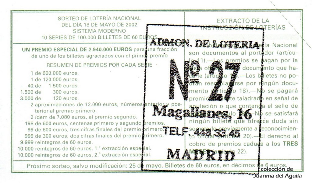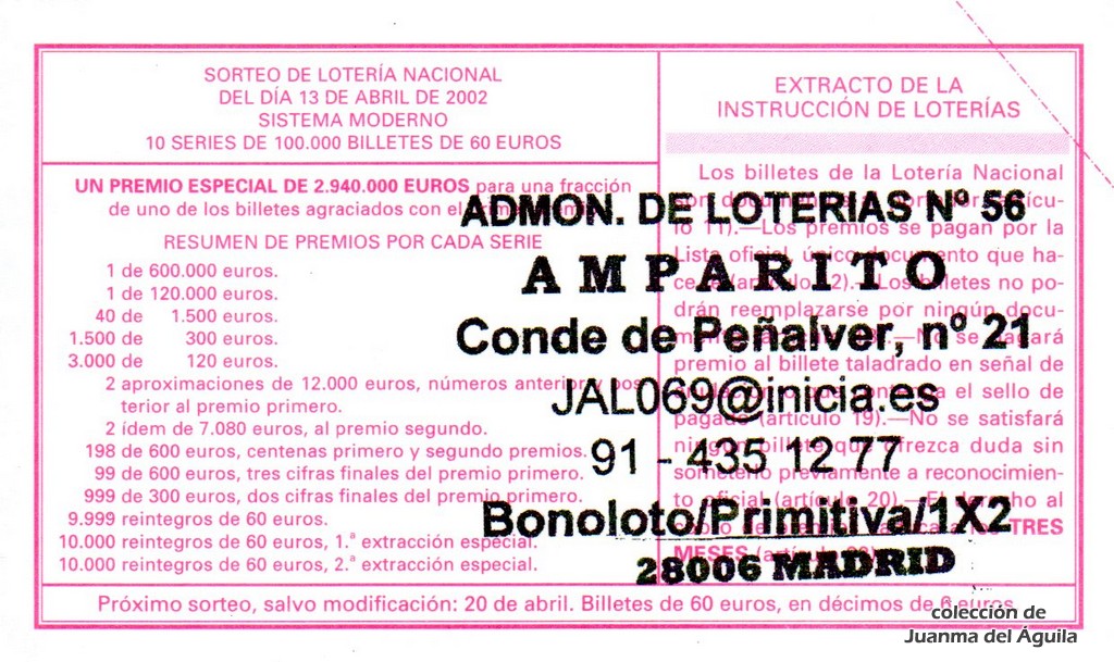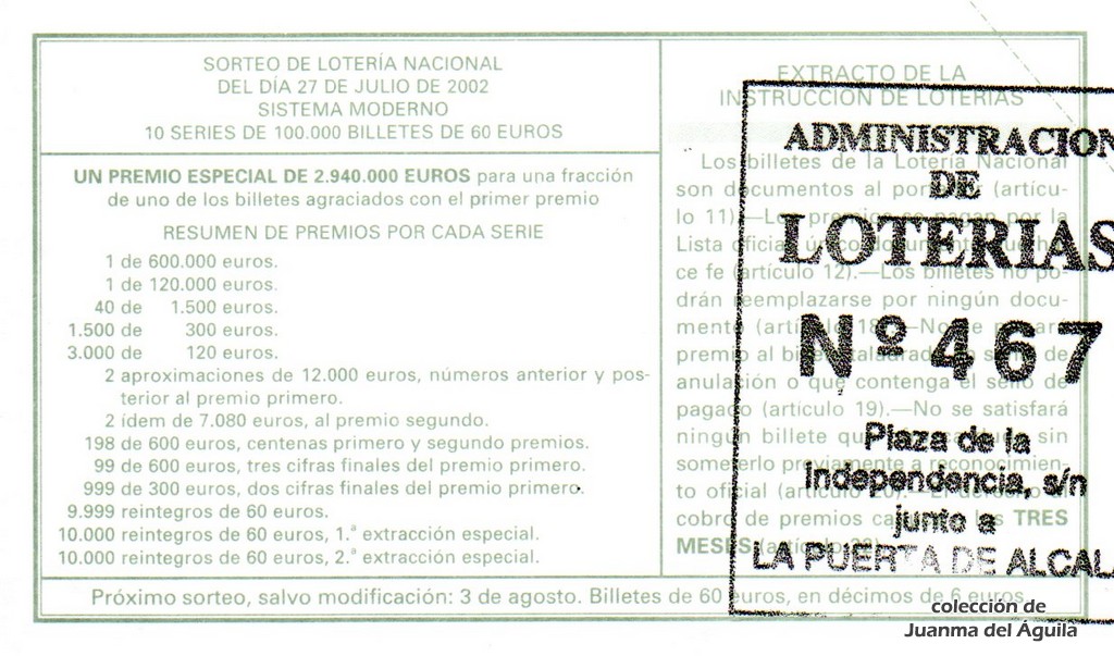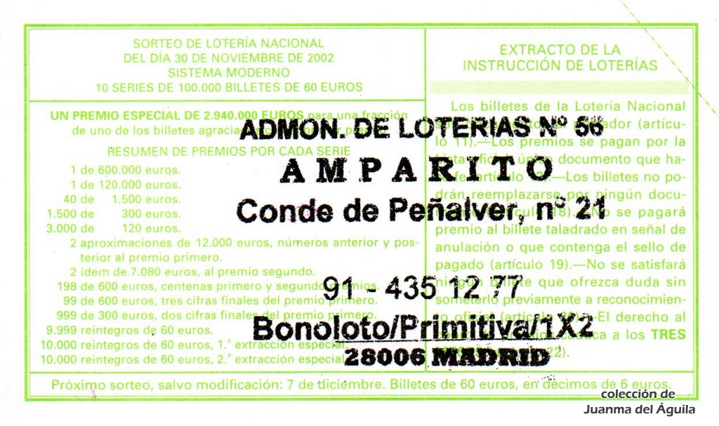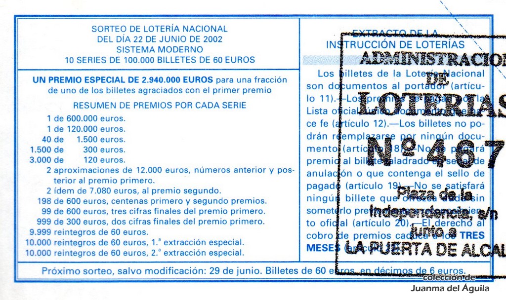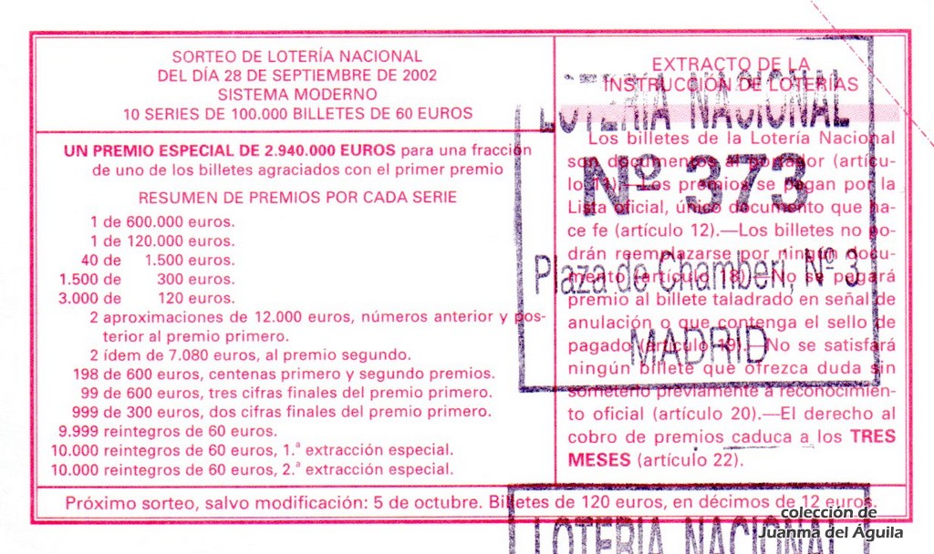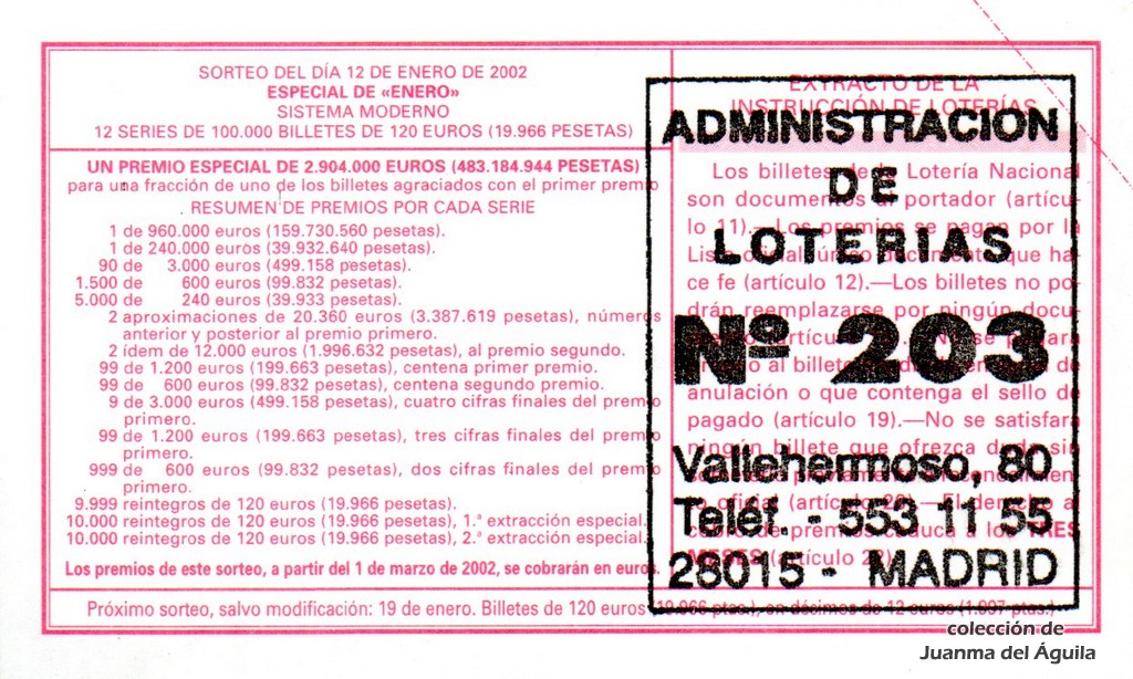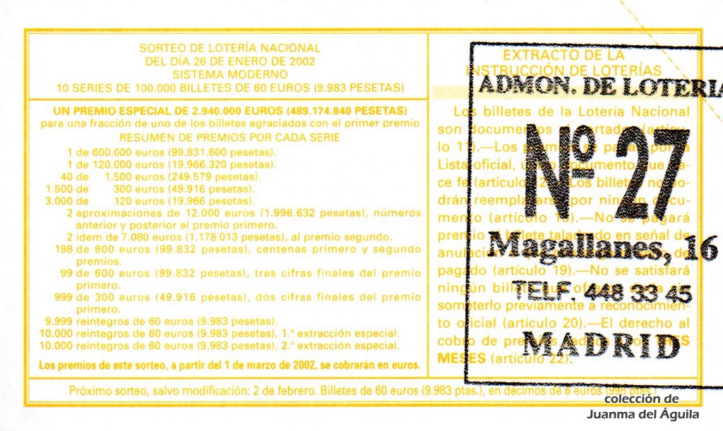 Los premios de este sorteo, a partir del 1 de marzo de 2002, se cobrarán en euros.