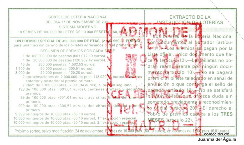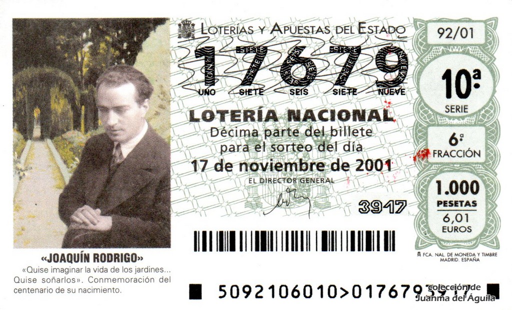 Precio del décimo: 1.000 pesetas / 6,01 euros