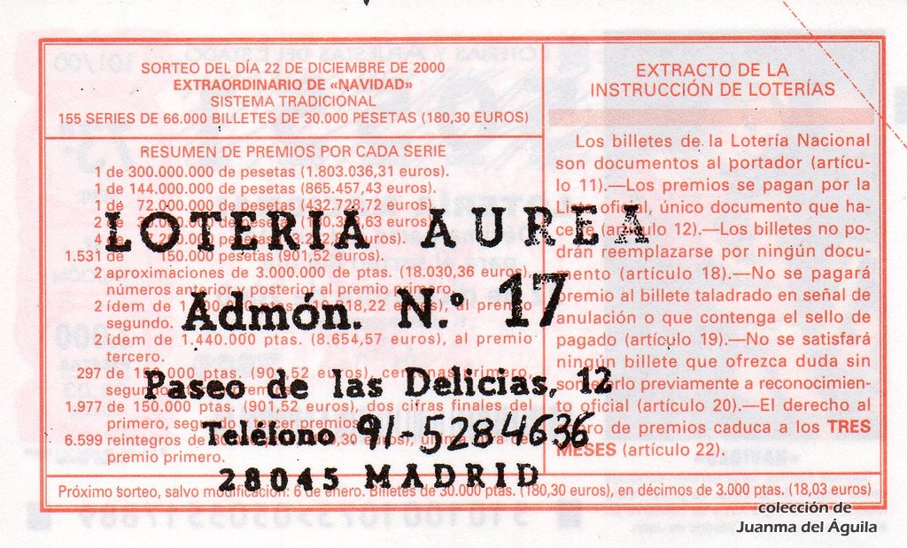 Precio del décimo: 3.000 pesetas / 18,03 euros