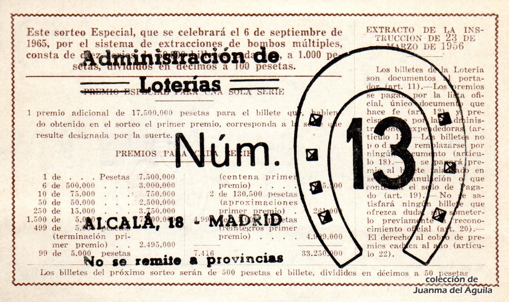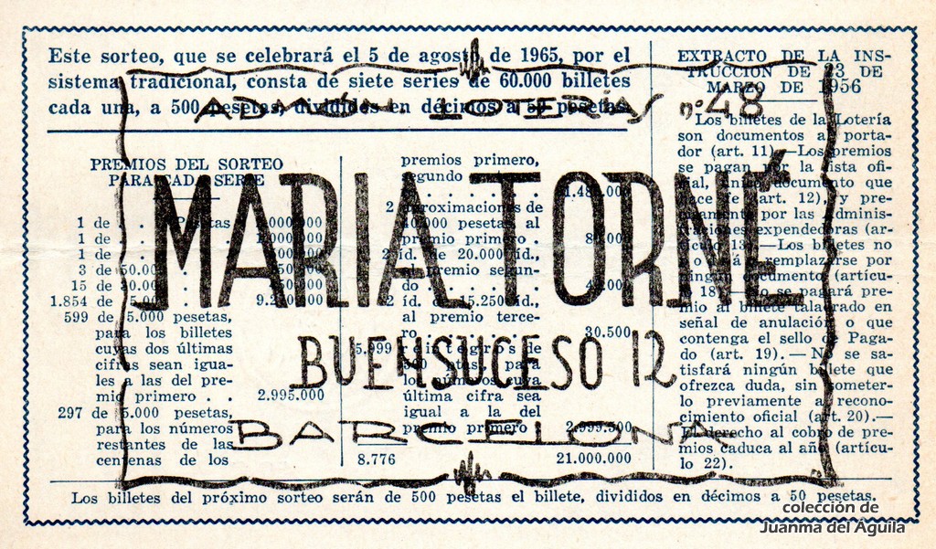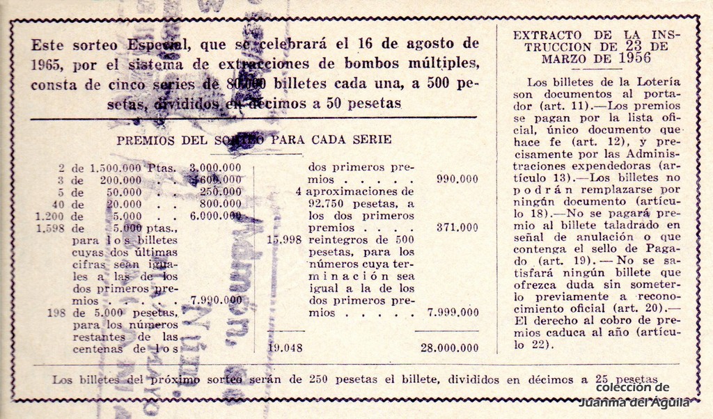 Sorteo nº 65, celebrado el 19 de agosto, la Ilustración se refiere a "«ARTESANÍA ESPAÑOLA». Almohada de palillar, para elaboración de los encajes típicos conocidos como camariñas, s. XX. Mujía (La Coruña). Museo do Pobo Galego, Santiago de Compostela."