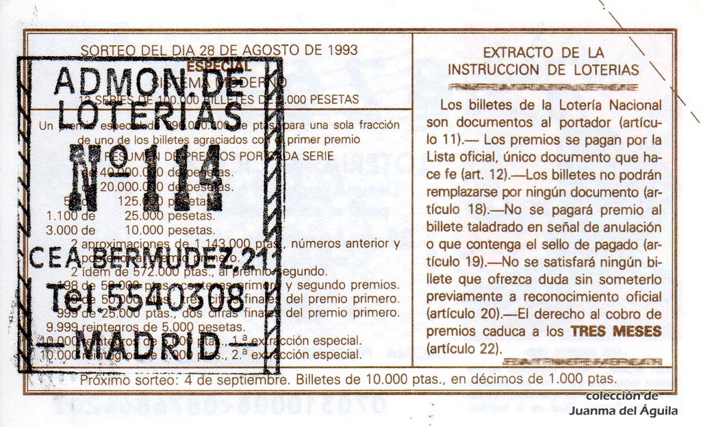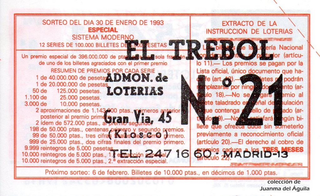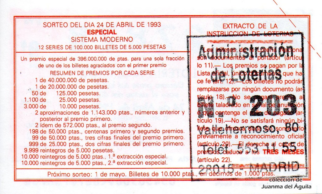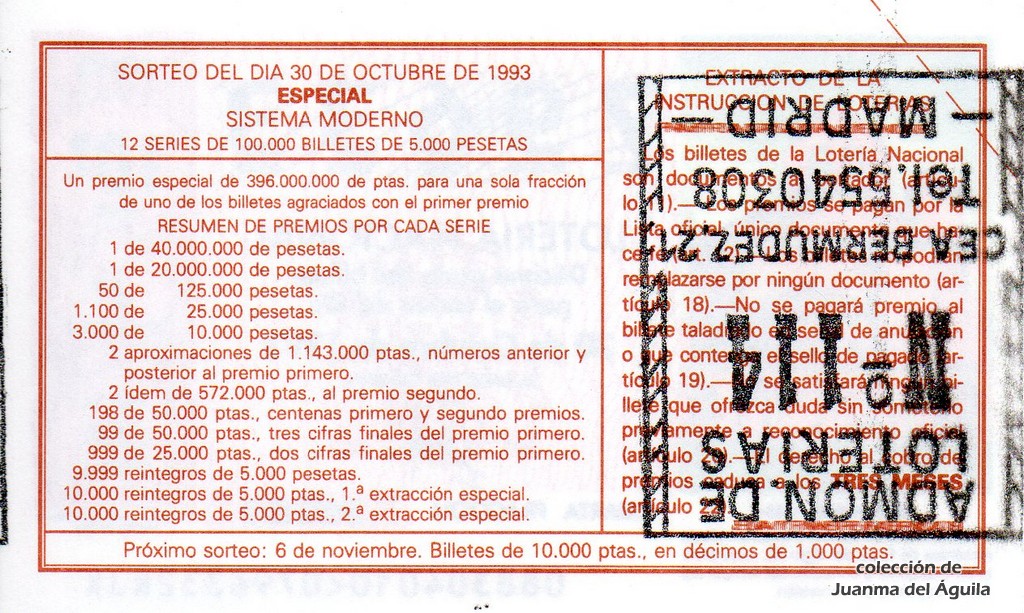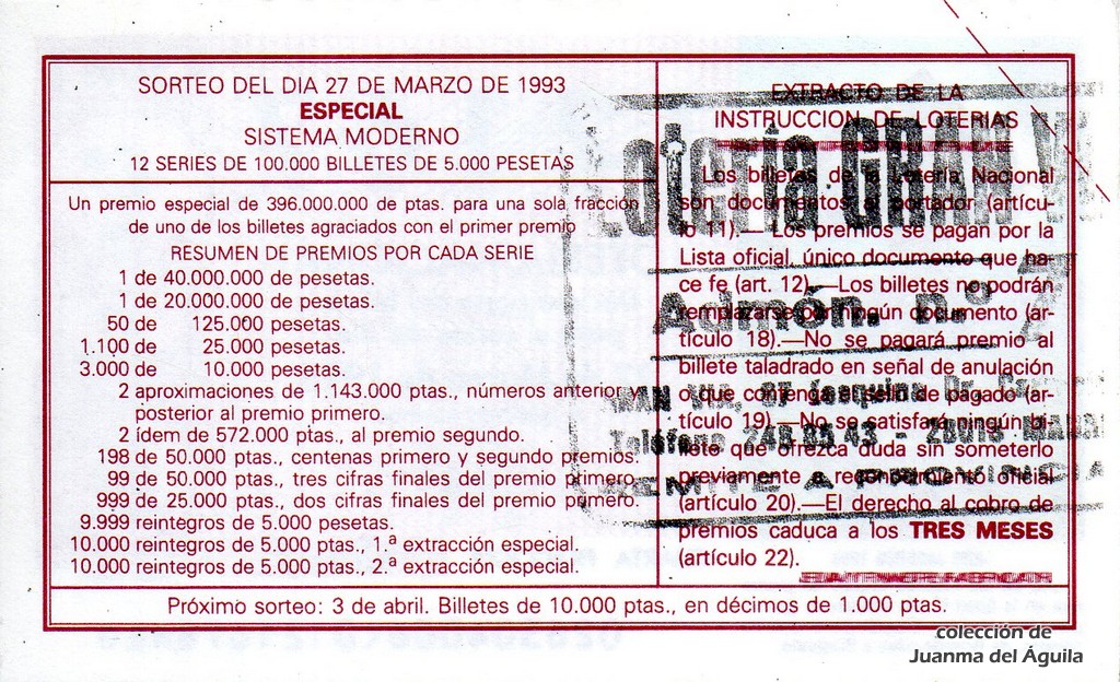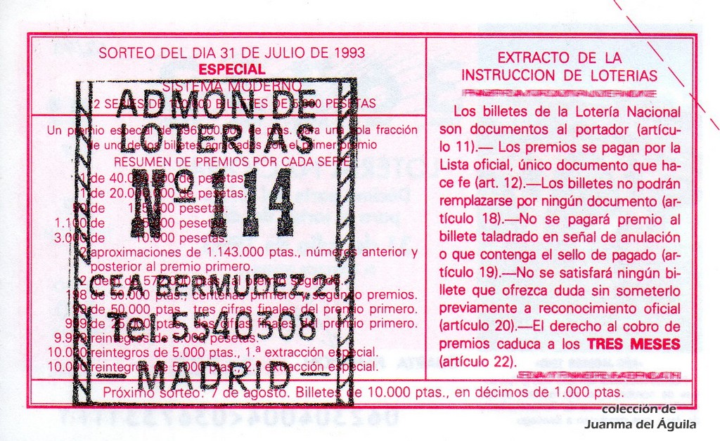 Sorteo nº 10 especial, celebrado el 30 de enero, la Ilustración se refiere a "«AÑO JACOBEO 1993» Santiago de Compostela. Figuras de S. Pedro, S. Pablo, Santiago y S. Juan, situadas en el Pórtico de la Gloria, joya del románico atribuida al Maestro Mateo (S. XII)."