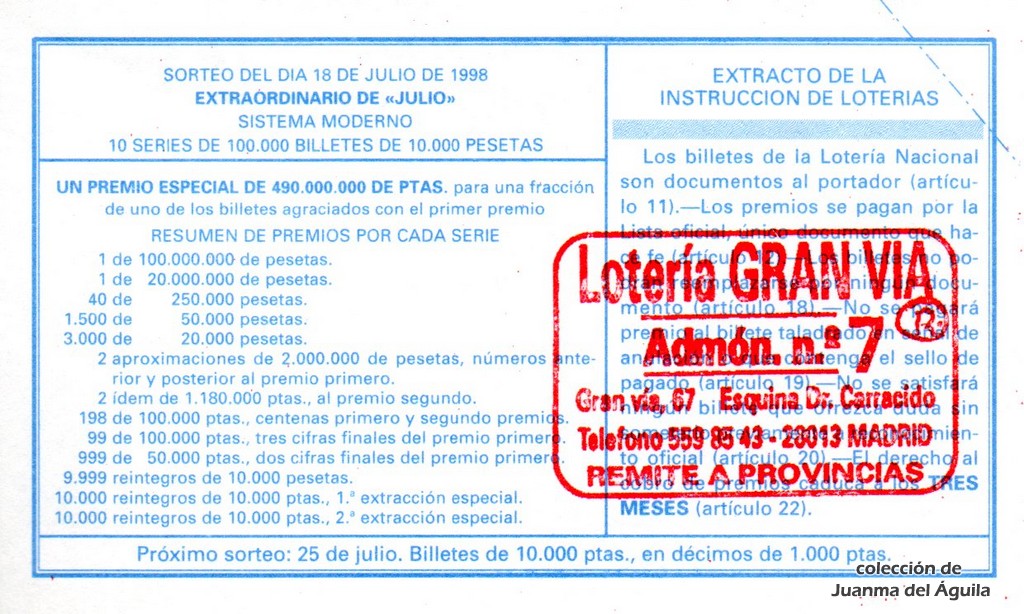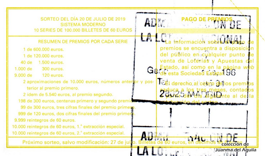 Sorteo nº 19 extraordinario de Los Millones, celebrado el 5 de julio, la ilustración se refiere a "CAMINO DE SANTIAGO – HOSPITAL REAL – SANTIAGO DE COMPOSTELA"
