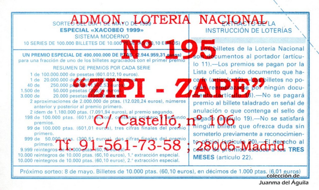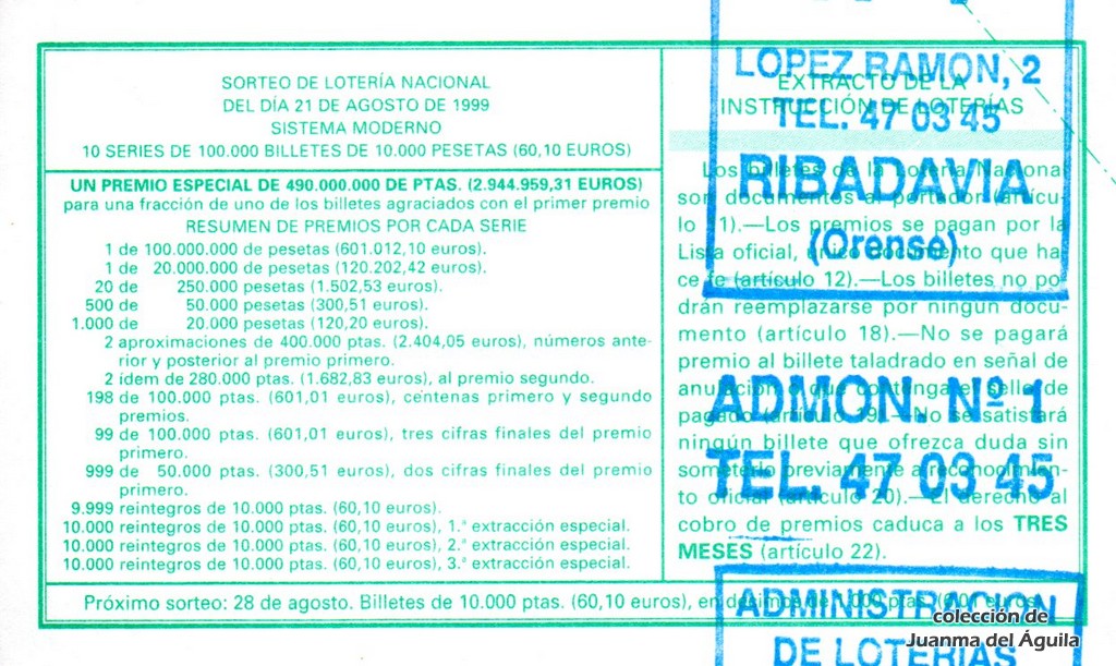 En el año 1999 (dedicado a "Naturaleza y Flora e Ingeniería Española") en el sorteo nº 35 especial «XACOBEO 1999», celebrado el 1 de mayo, la Ilustración se refiere a "«XACOBEO'99». El Xacobeo'99, en Galicia, un encuentro con el espíritu y la cultura internacionales por el Camino de Santiago."
